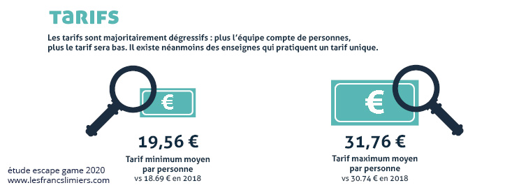 Côté tarif, les escape games ont des tarifs en 2020 sensiblement identiques à ceux de 2018. Cependant, on note tout de même une légère augmentation. A la fois sur les prix minimaux moyens (19.56€ / personne en 2020, vs 18.69€ / personne en 2018) que les prix maximaux moyens pratiqués (31.76€ en 2020 vs 30.74€ en 2018).